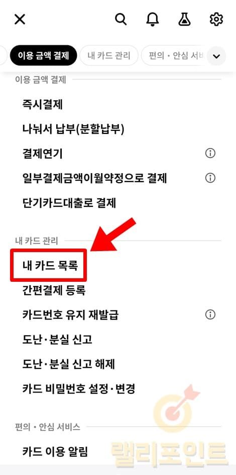 1. 내 카드 관리 메뉴에서 내 카드 목록을 클릭합니다.