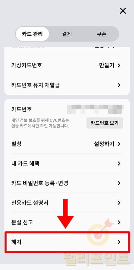 1. 카드 메뉴에서 해지를 선택합니다.