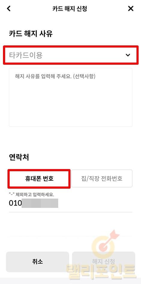 1. 카드 해지 사유와 연락처를 입력합니다.