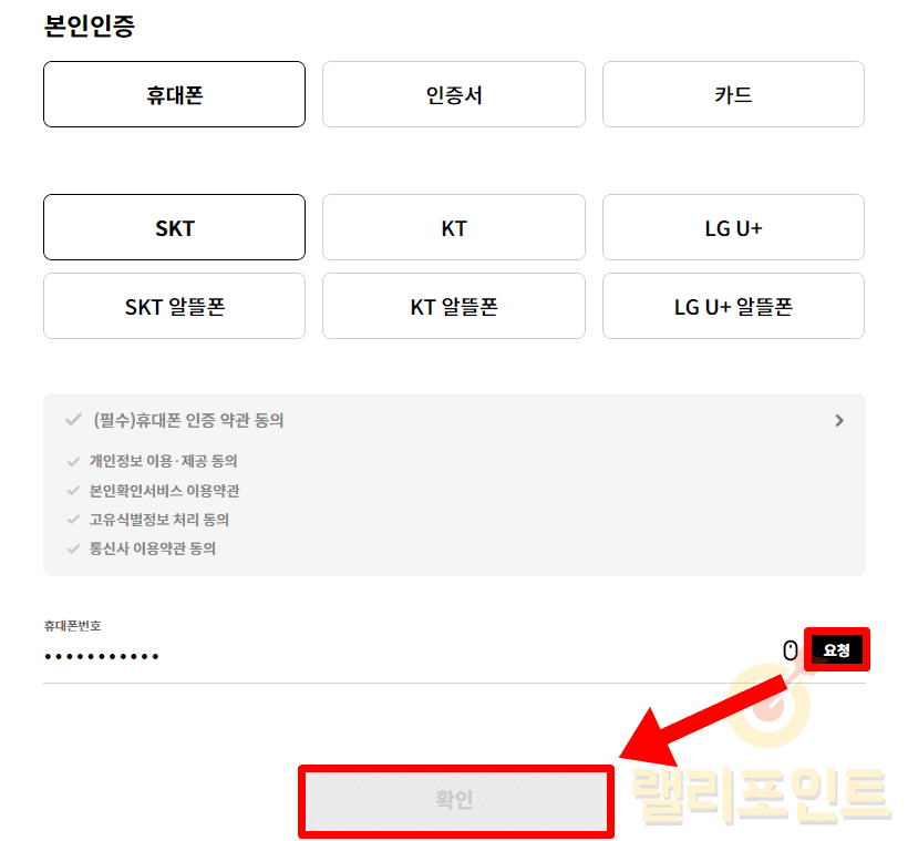 1. 휴대폰 정보 입력 후 요청 버튼을 눌러 문자 인증을 진행합니다.