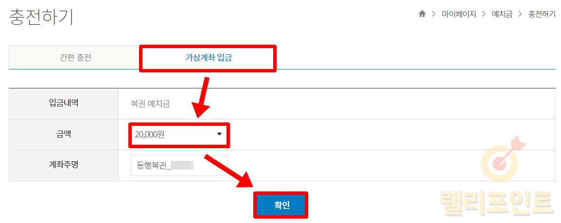 1. 가상계좌 입금을 선택하고 충전 금액을 설정합니다.