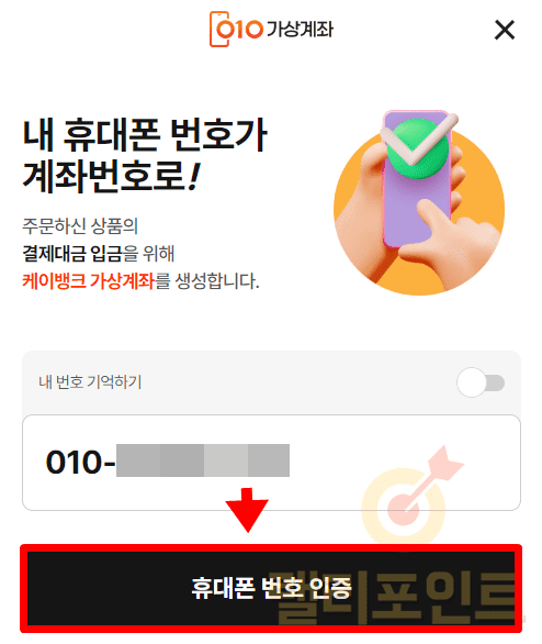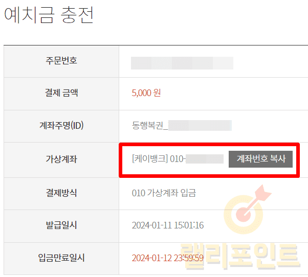 가상계좌번호는 나의 휴대폰번호이며 은행은 케이뱅크이니 참고하세요. 이제 편하신 이체수단으로 충전금액을 송금하시면 됩니다.