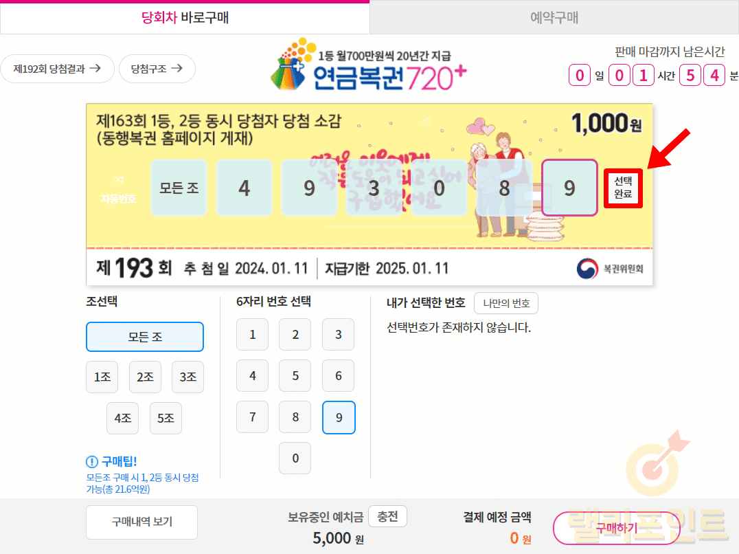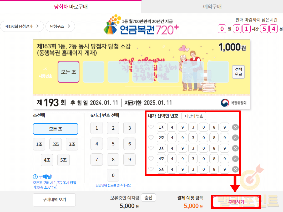 1. 내가 선택한 연금복권 번호를 확인합니다.