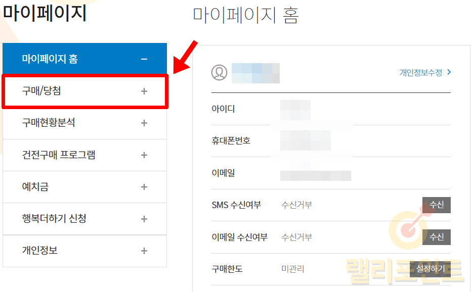 1. 좌측에서 구매/당첨을 누릅니다.