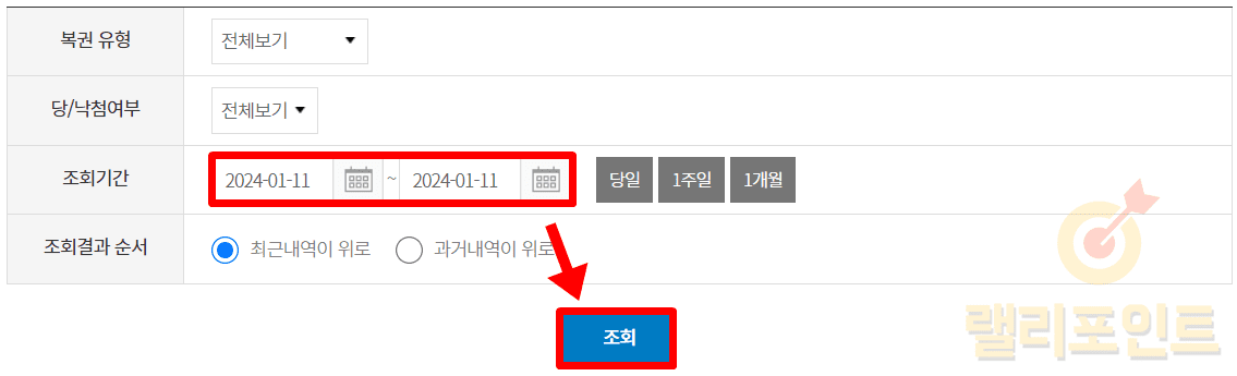 1. 연금복권을 구매한 날짜를 설정하고 조회를 클릭합니다.