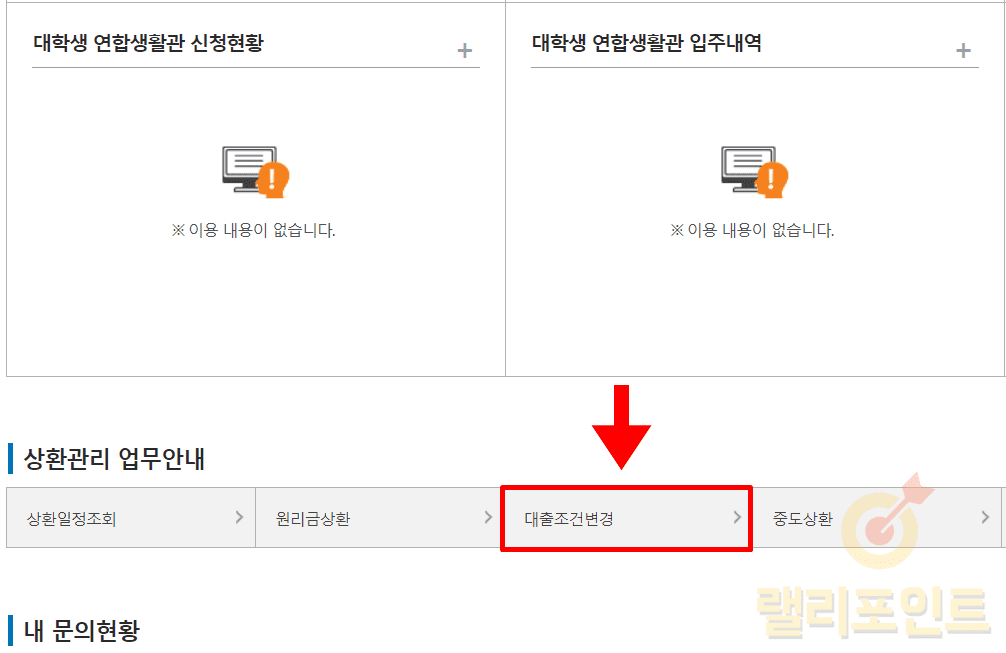 - 상환관리 업무안내에서 대출조건변경을 클릭합니다.