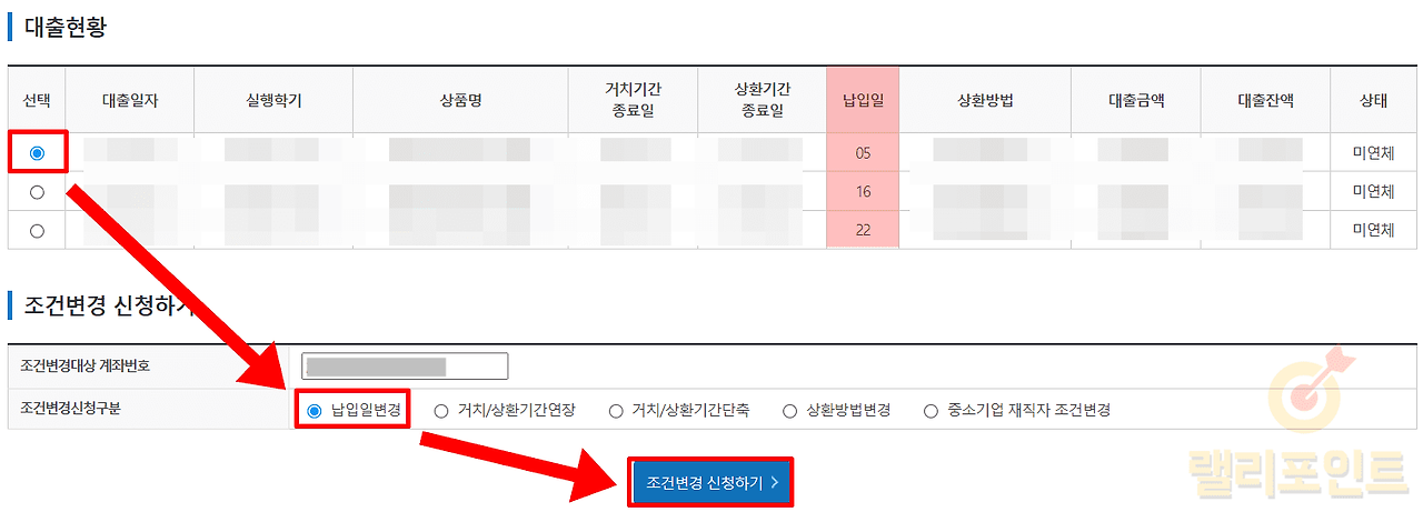 납부일을 변경하고 싶은 대출을 체크합니다.