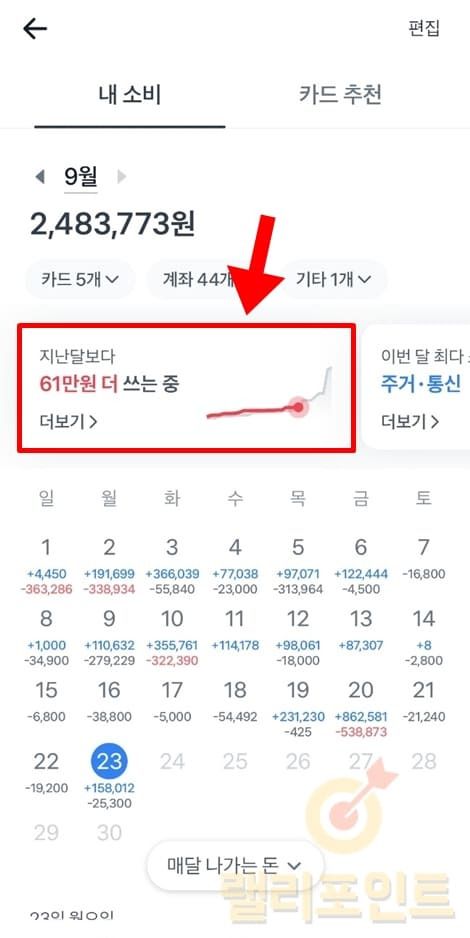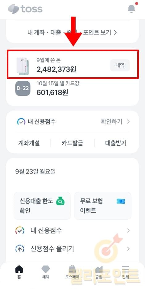 1. 홈 화면 아래에서 X월에 쓴돈(이번 달 쓴 금액)을 클릭합니다.