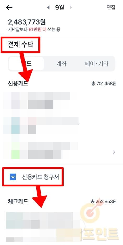 또한 토스 가계부 화면을 아래로 내려보시면 신용카드별 지출금액과 신용카드 청구서도 확인할 수 있습니다. 만약 사용하지 않는 카드에서 지출과 청구가 발생하고 있다면 카드를 정지한 후 사용내역에 대해서 환불을 요청하는 것이 좋습니다.