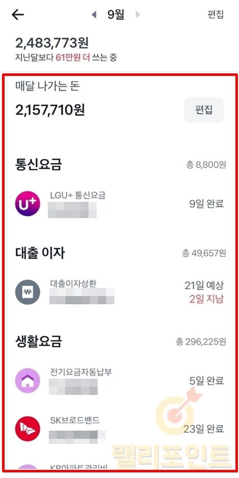 토스 각계부의 화면을 아래로 더 내려보시면 매달 나가는 돈을 확인할 수 있습니다. 이곳에서는 고정비 개념으로 내가 매달 꾸준히 나가는 통신요금, 대출이자, 생활요금등의 정보와 금액을 확인할 수 있습니다. 그래서 이곳에서 내가 사용하지 않는 구독 서비스와 지출이 있다면 확인 후 해지하는 것이 좋습니다.
