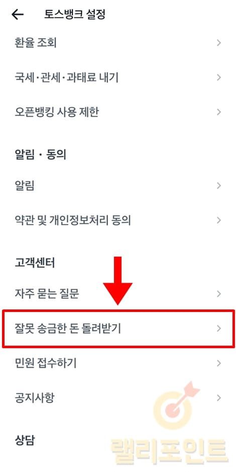 1. 고객센터 > 잘못 송금한 돈 돌려받기를 누릅니다.