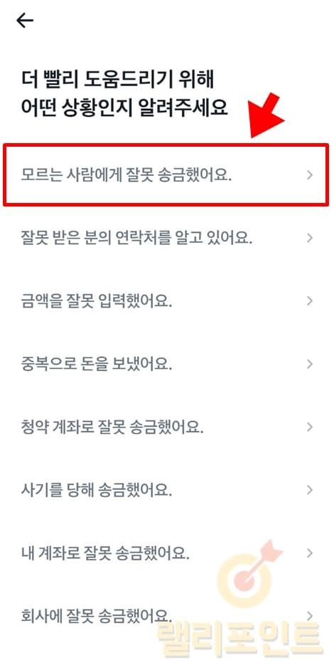 1. 착오 송금로 인한 현재 상황에 맞는 사유를 선택합니다.
