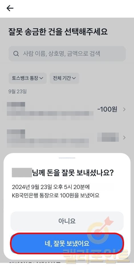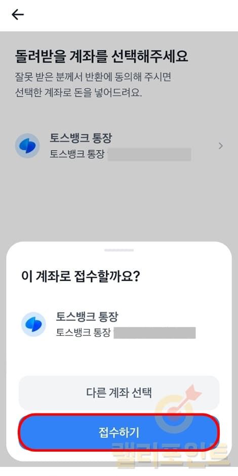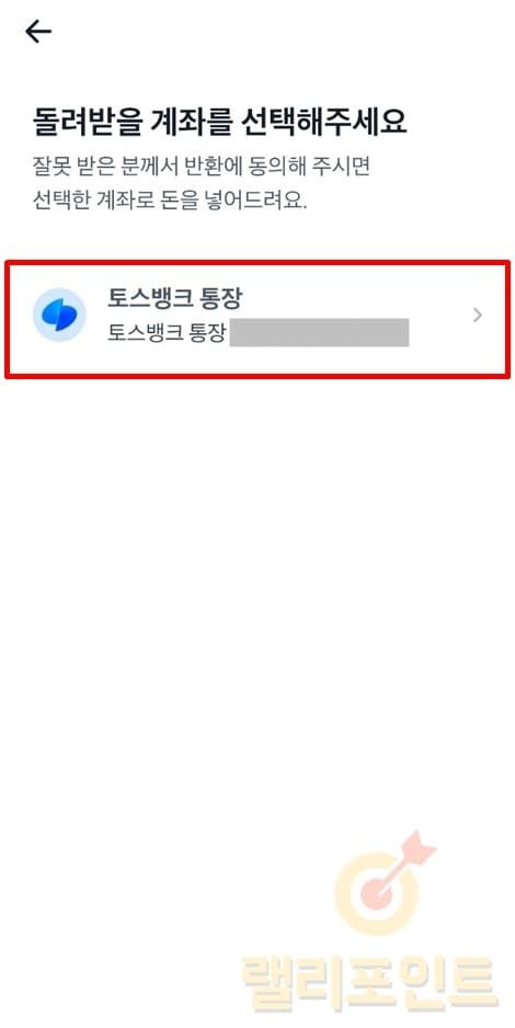 1. 잘못보낸 돈을 돌려받을 계좌를 선택합니다.