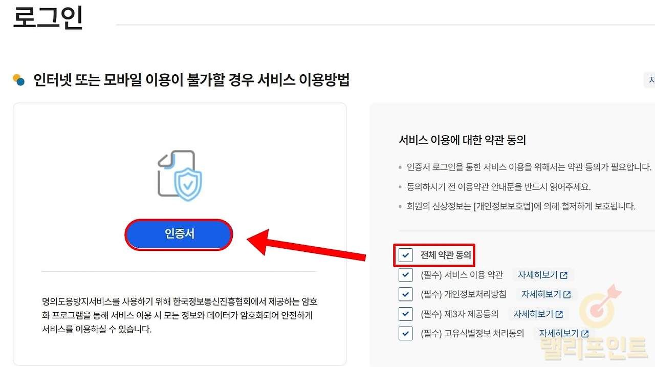 - 전체 약관 동의에 체크하고 인증서를 누릅니다.