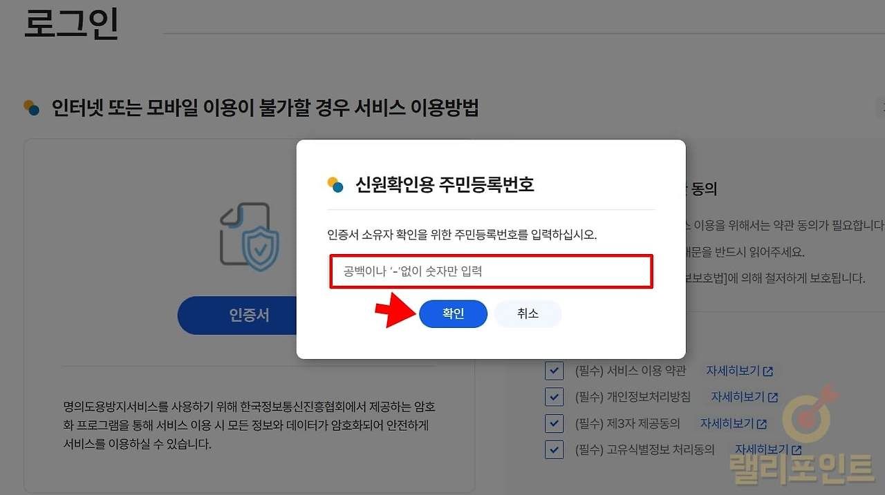 4.나의 주민등록번호를 입력하고 확인을 누릅니다.