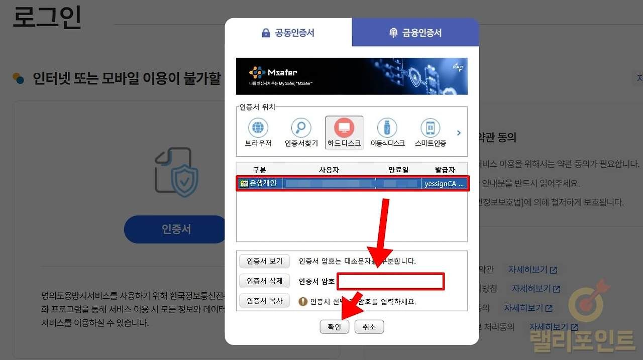 - 공동인증서나 금융인증서를 선택한 후 암호를 입력하여 인증합니다.