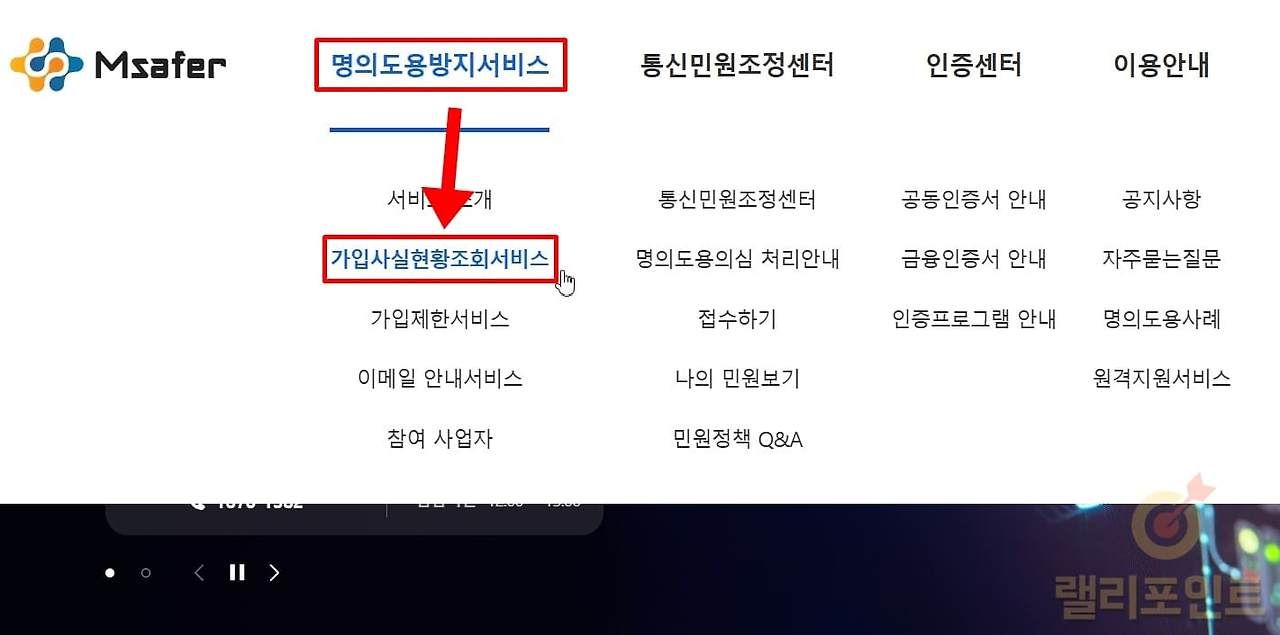 - 상단 메뉴에서 명의도용방지서비스 > 가입사실현황조회서비스를 클릭합니다.