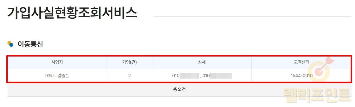 확인할 수 있는 정보로는 통신사 사업자명, 가입 건수, 휴대폰 번호, 통신사 고객센터가 있습니다. 만약 내가 개통하지 않은 휴대폰번호가 있다면 명의도용이 의심되는만큼 통신사 고객센터로 전화를 거신 후 즉시 중지 및 해제를 신청하는 것을 추천드립니다.