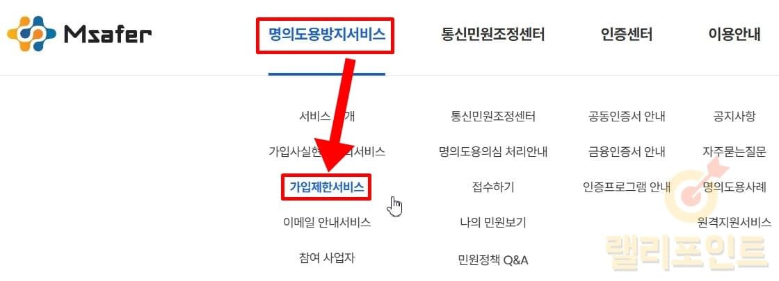 - 엠세이퍼 사이트에서 명의도용방지서비스 > 가입제한서비스를 클릭합니다.
