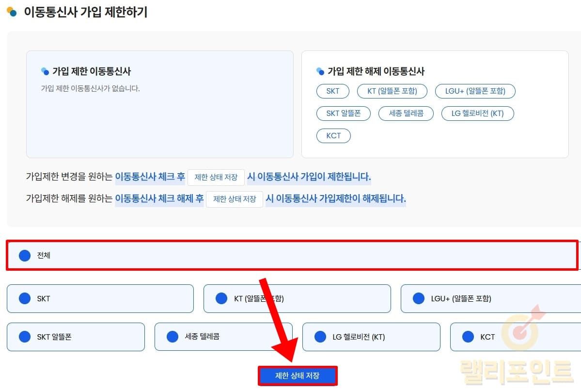 가입 제한하고 싶은 이동통신사를 모두 선택합니다.