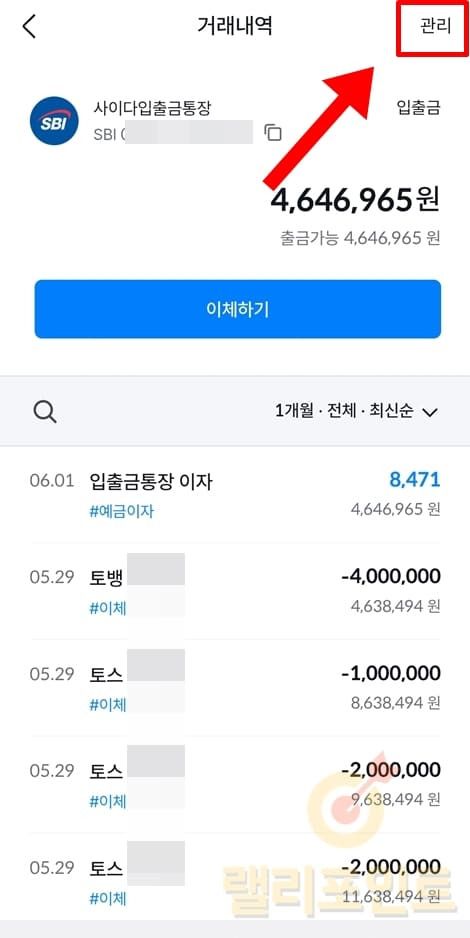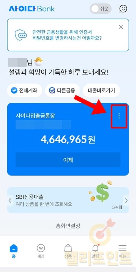- 나의 입출금통장 우측의 더보기 버튼을 누릅니다.