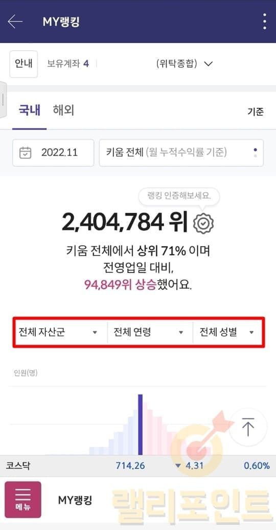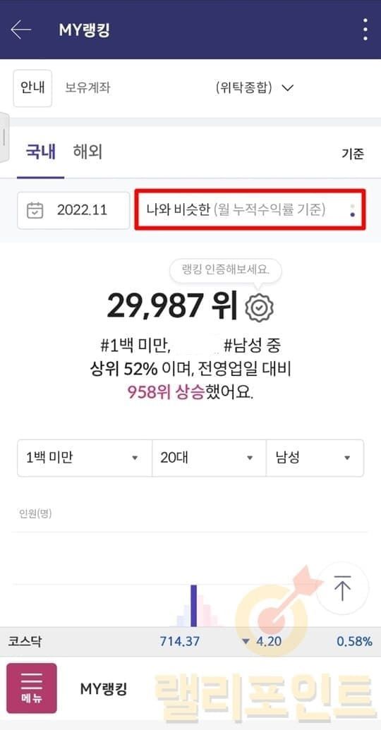 키움증권 MTS가 영웅문S#으로 체인지되면서 투자관련 재밌는 기능들이 많이 생겼습니다.그 중에서 많은 키움의 투자자들이 활발하게 사용하고 있는 기능 중에 MY랭킹 서비스를 소개드려볼까합니다. 키움 MY랭킹이란 키움증권 계좌의 국내/해외 주식의 수익률 순위와 백분위 정보를 제공하는 서비스입니다. 키움의 MY 랭킹에서는 전체 키움증권 고객의 순위를 볼 수 있어서 나의 객관적인 투자실력을 평가하기 유용하며 또한 수익률 랭킹 순위를 나와 비슷한 그룹만 설정하여 볼 수 있다는 것도 큰 장점입니다.