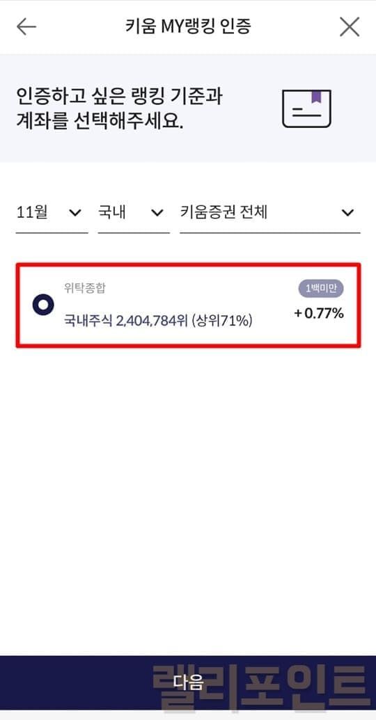 1. 키움 MY랭킹을 인증할 계좌를 선택합니다.