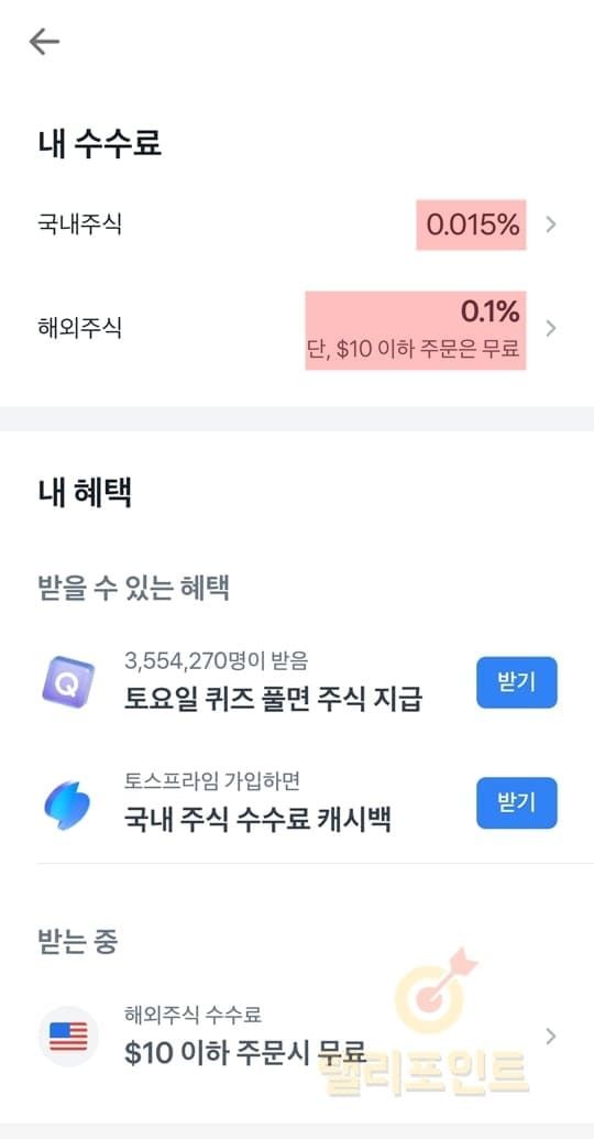 내 혜택 화면에서 받는중 목록에서 나의 토스증권 주식 거래의 혜택을 모두 확인할 수 있습니다. 이곳에서 국내주식 수수료와 해외주식 수수료 할인 혜택이 적용되어 있다면 고려하여 수수료를 계산해보셔야 합니다.