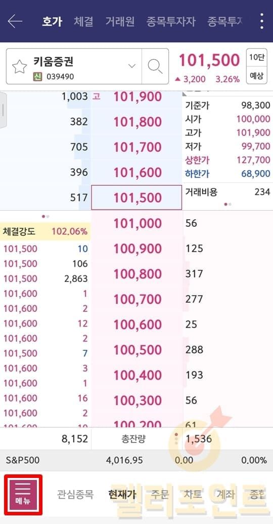 위 메뉴를 사용한 방법으로 동일하게 적용하시면 됩니다. 영웅문S# 앱에서 메뉴 클릭 > 국내주식 > 현재가를 누르시면 됩니다. 이러면 현재가, 주문, 차트, 계좌 메뉴 설정이 모두 국내주식으로 전환되게 됩니다.