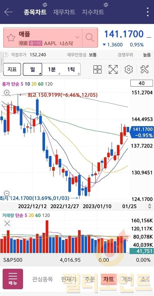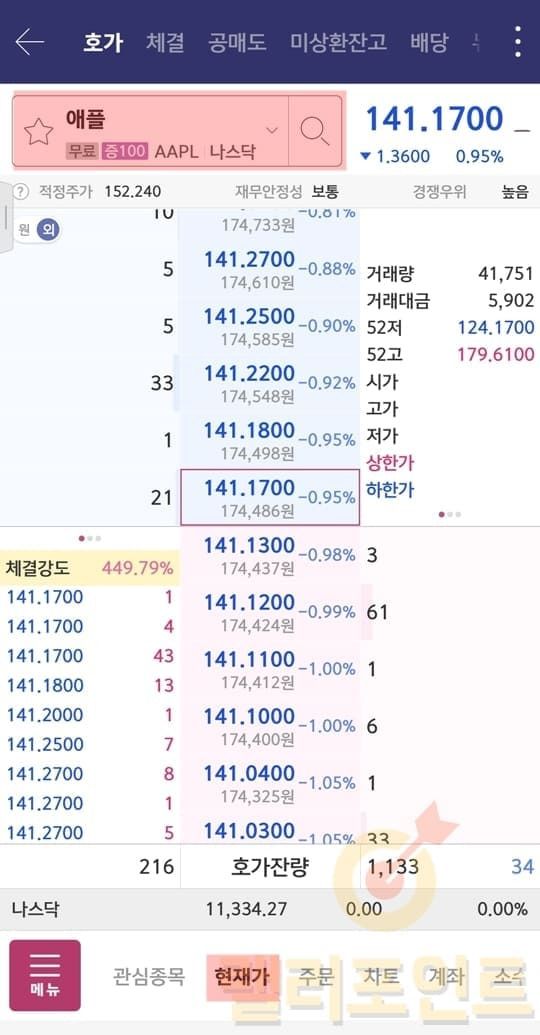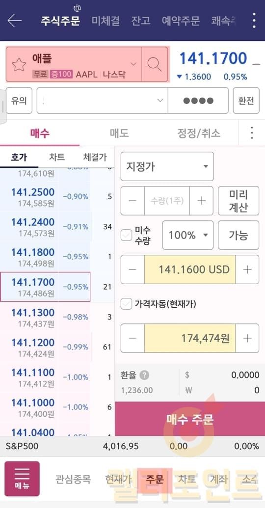 현재가, 주문, 차트, 계좌 메뉴를 눌러보시면 모두 해외주식 투자로 변경된 것을 볼 수 있습니다. 이렇듯 영웅문S#은 기본 투자 설정이 국내주식인데 메뉴에서 해외주식의 아무 메뉴라 클릭하면 모든 설정이 해외주식으로 전환되게 됩니다.