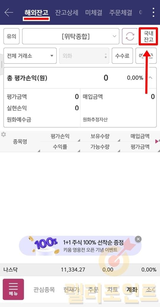 2. 우측 상단에서 해외잔고 버튼을 클릭합니다.