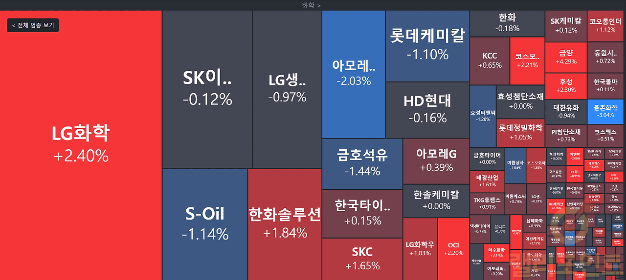 - 보고 싶은 업종을 누르면 업종에 포함된 종목의 트리맵만 볼 수 있습니다.