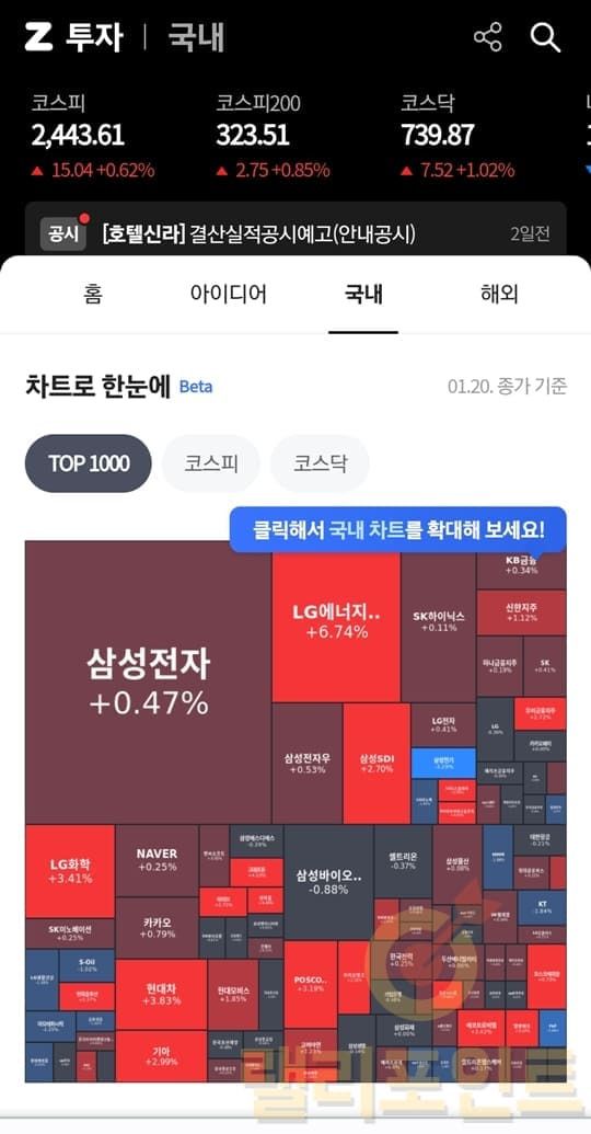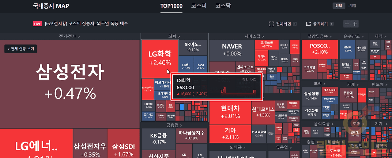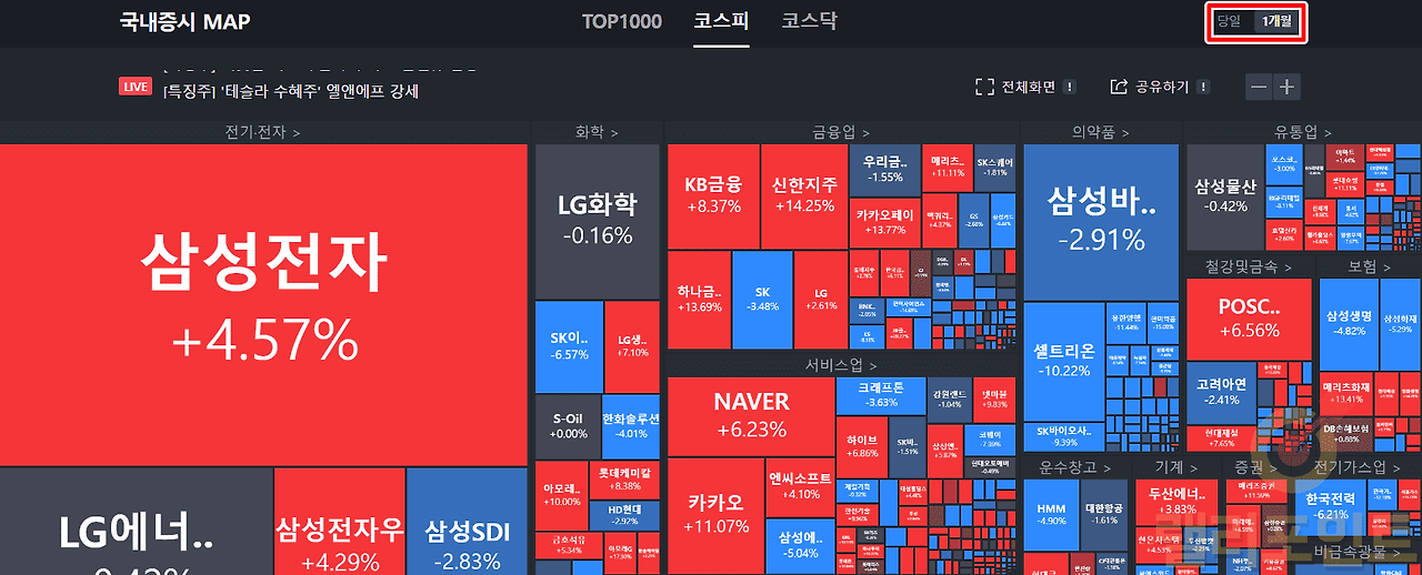 - TOP 1,000가지로 구성된 국내주식의 업종 트리맵을 확인할 수 있습니다.