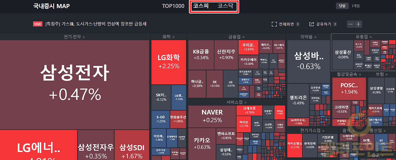 국내증시 MAP 상단에서 TOP1000이 아닌 코스피/코스닥을 선택해서 원하는 시장의 트리맵 지도만 확인할 수 있습니다.