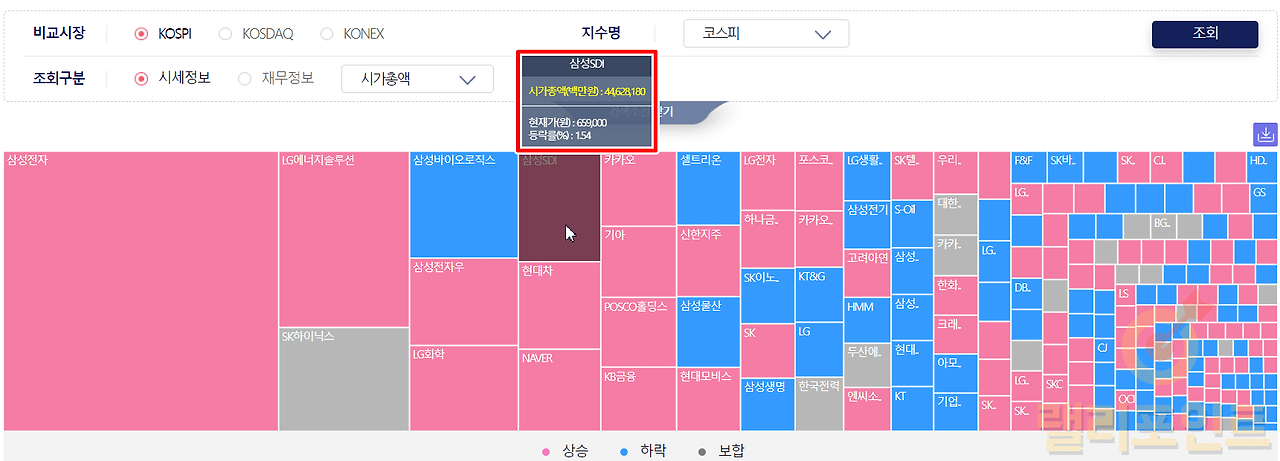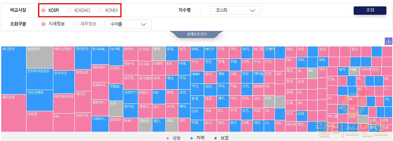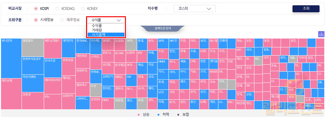- 보고 싶은 시장을 선택합니다. (코스피/코스닥/코넥스)