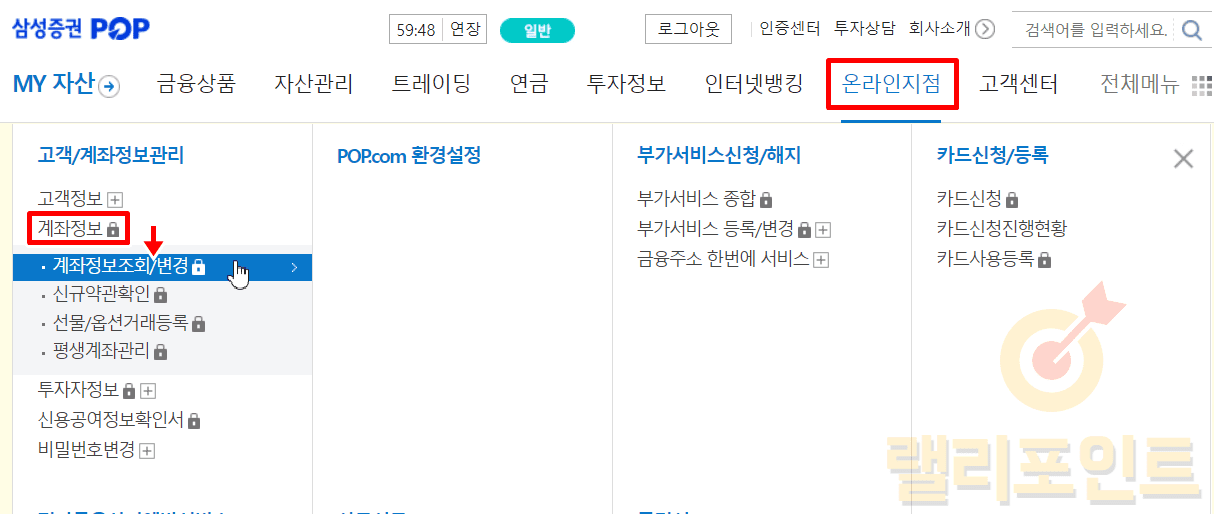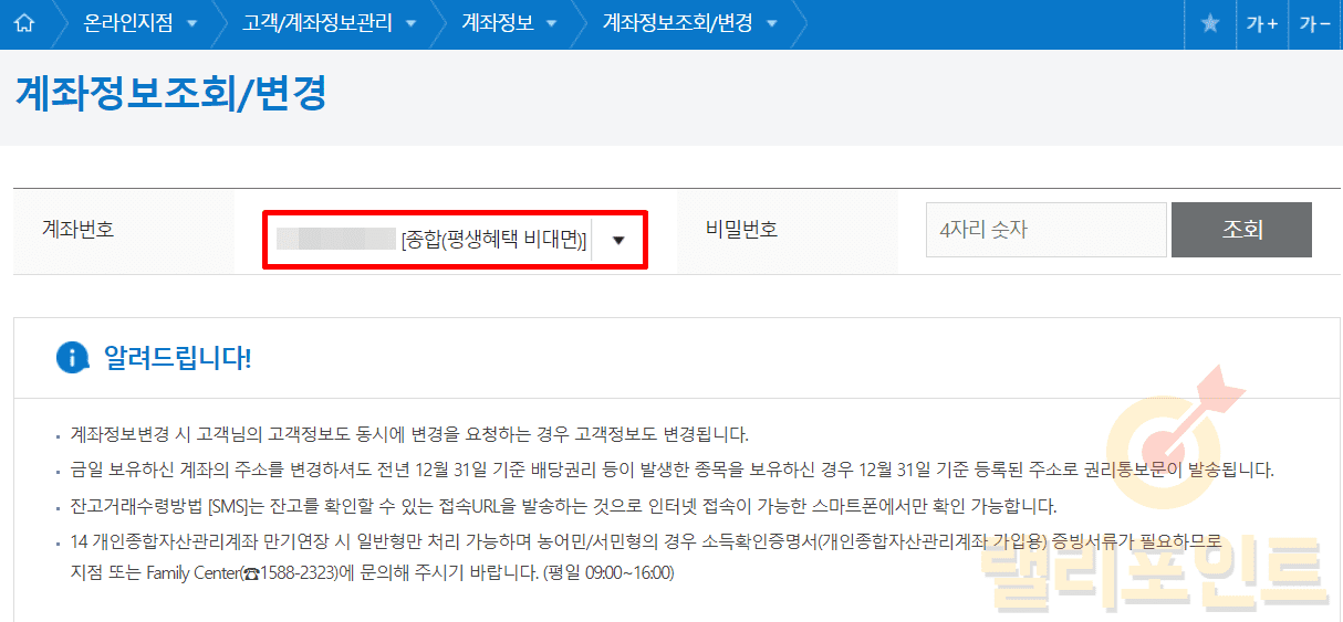 1. 온라인지점 > 고객/계좌정보관리 > 계좌정보 > 계좌정보조회/변경을 클릭합니다.