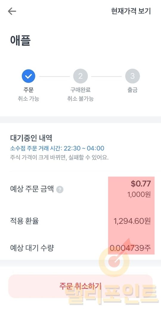 상세 정보에서 예상 주문금액, 적용 환율, 예상 대기 수량을 볼 수 있습니다. 아직 매수가 되지 않았다면 주문 취소하기를 눌러 매수되지 않게 취소가 가능합니다.