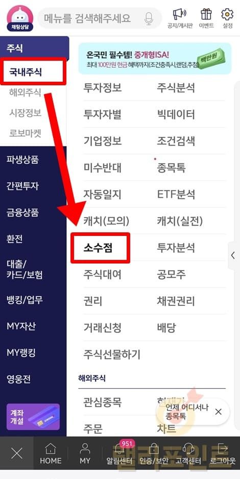 1. 주식 > 국내주식 > 소수점을 클릭합니다.