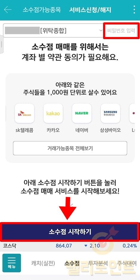 1. 계좌 비밀번호를 입력하고 소수점 시작하기를 누릅니다.