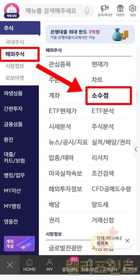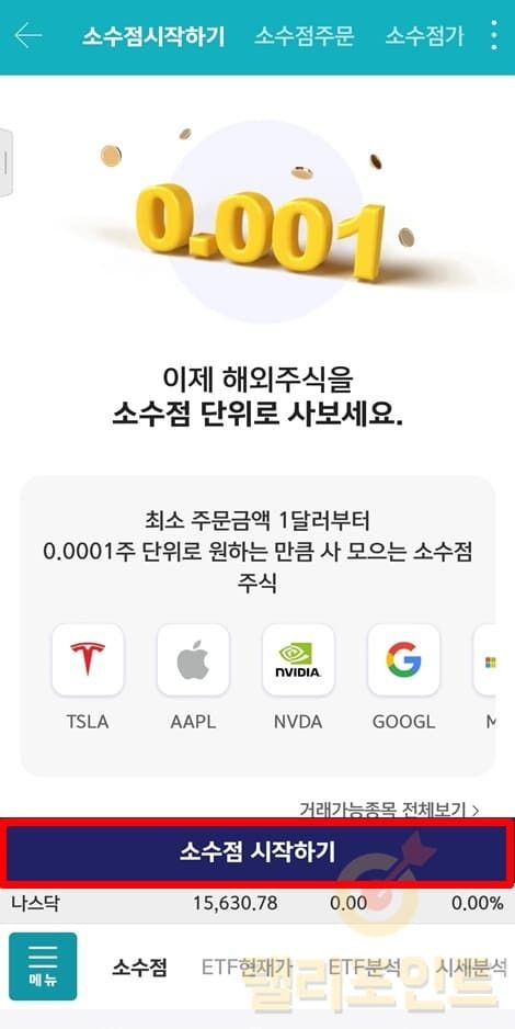 1. 상단 메뉴에서 소수점주문을 클릭합니다.
