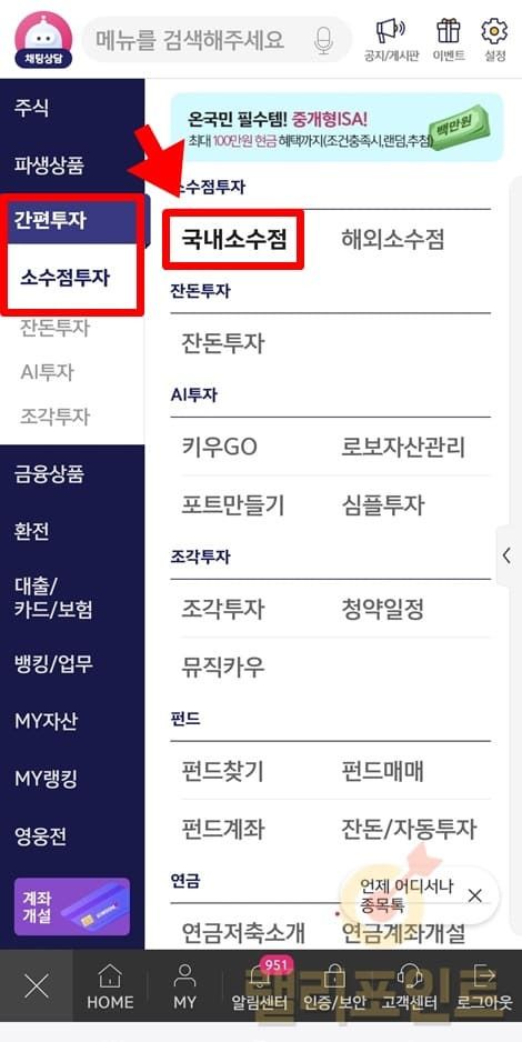 1. 영웅문S# 메뉴에서 간편투자 > 소수점투자 > 국내소수점을 클릭합니다.