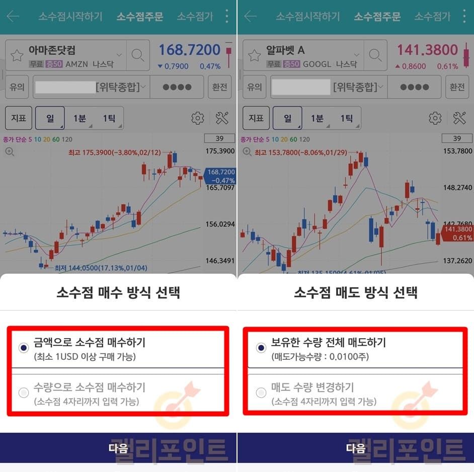 소수점 매수시에는 금액으로 소수점 매수, 수량으로 소수점 매수 중에서 선택할 수 있고 소수점 매도시에는 보유한 수량 전체 매도, 매도 수량 직접 입력 중에서 선택이 가능합니다.