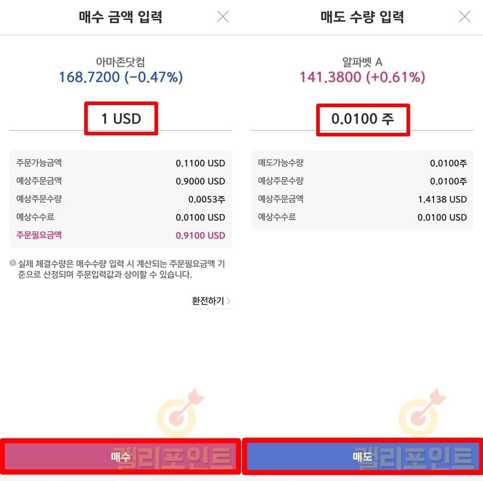 1. 매수 금액 입력 또는 매도 수량을 입력합니다.