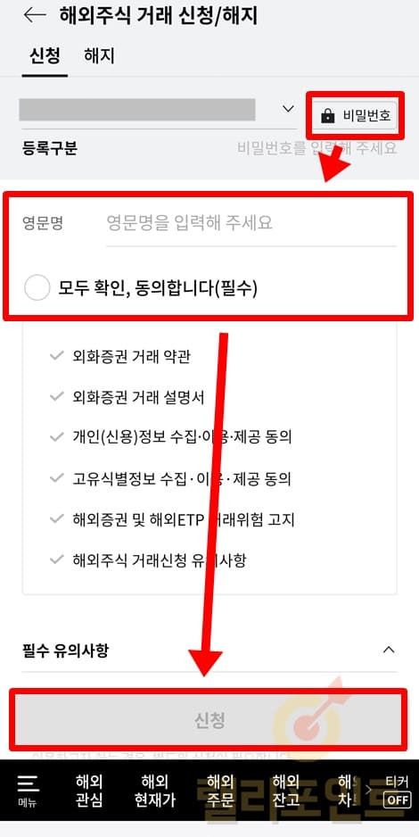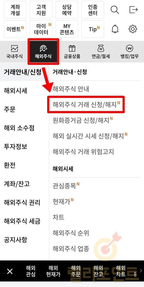 1. 해외주식 > 해외주식 거래 신청/해지를 클릭합니다.