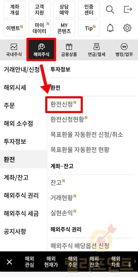1. 해외주식 메뉴 아래에서 환전신청을 클릭합니다.