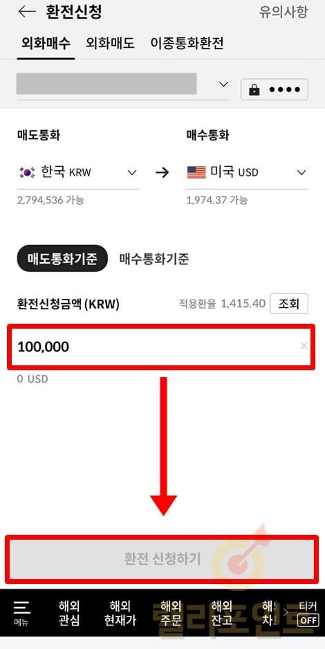 1. 원화를 입력한 후 환전 신청하기를 클릭합니다.