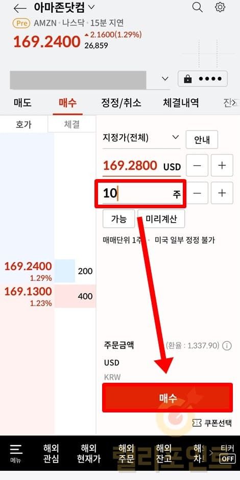 1. 매수 수량을 입력하고 매수 버튼을 클릭합니다.